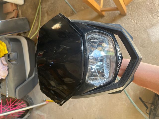 Careta para moto de la marca Twenty. ESTA NUEVA, no se ha puesto en moto nunca, pero esta sucia - Diseño moderno y deportivo. - Color negro brillante. - Incluye faro delantero.