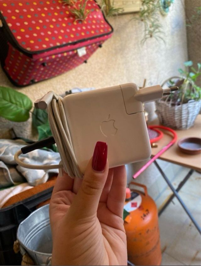 Cargador blanco para MacBook. - Diseño compacto y portátil. - Cable integrado para facilitar el enrollado.