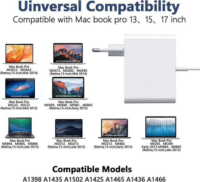 Detalles del productoCargador compatible con varios modelos de MacBook Pro.
