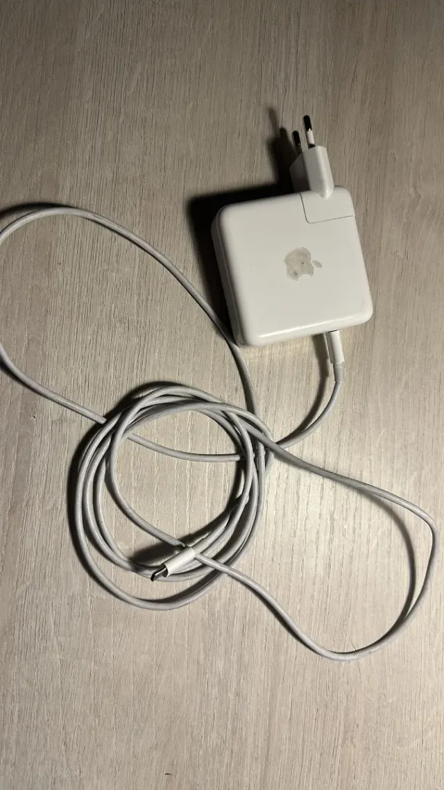 Adaptador de corriente blanco para MacBook Pro M1. - Diseño compacto y portátil. - Conector USB-C.