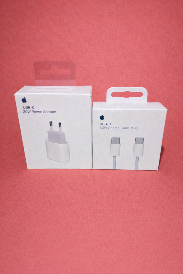 Pack de cargador y cable USB-C de Apple. - Cargador USB-C de 20W. - Cable de carga USB-C de 60W (1 metro).