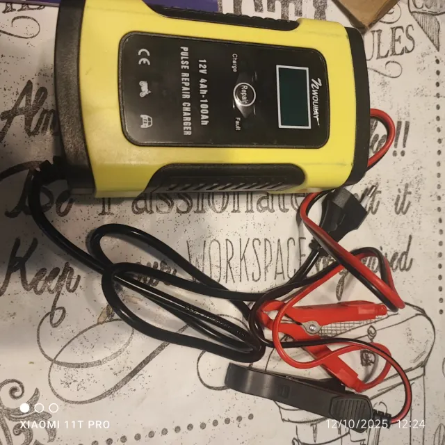 Detalles del productoCargador de batería para vehículos de 12V, apto para coches y motocicletas. Permite la carga y reparación de baterías.