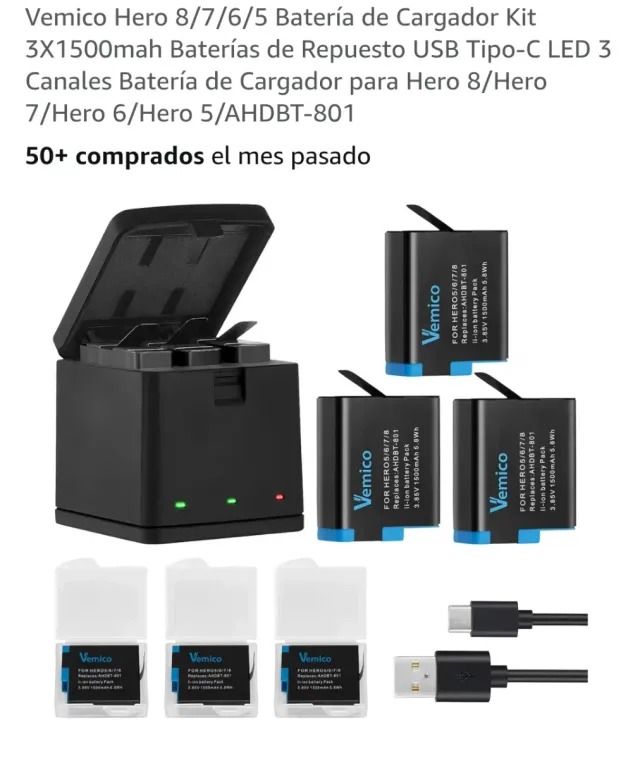 Kit de cargador y 3 baterías de repuesto para cámaras Hero 8/7/6/5. - Baterías de 1500mAh. - Cargador USB Tipo-C con 3 canales. - Indicadores LED de carga.