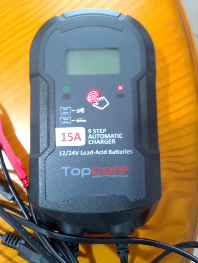 Cargador automático de baterías TopCore de 15A. - Diseñado para baterías de plomo-ácido de 12V y 24V. - Tecnología de 9 pasos para una carga eficiente.