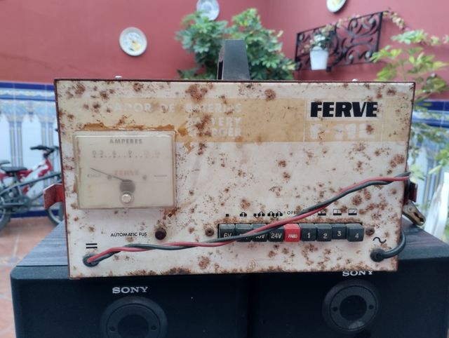 Detalles del productoCargador de baterías FERVE antiguo, en buen estado para su edad, aunque presenta señales de uso y algo de óxido.