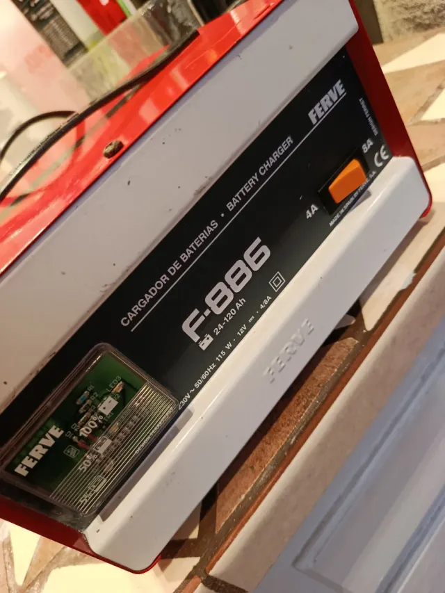 Cargador de baterías Ferve modelo F-886. - Capacidad de 24-120 Ah. - Voltaje de 12V. - Potencia de 115 W. - Corriente de carga 4/8A. - Fabricado en España.