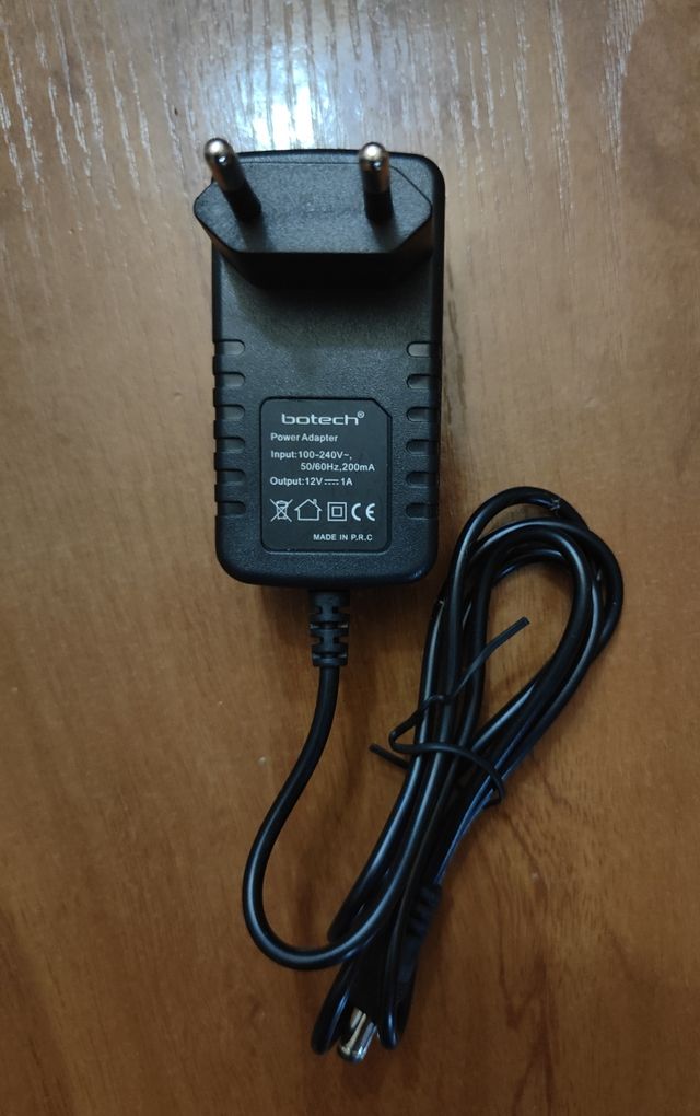 Adaptador de corriente Botech. - Entrada: 100-240V~, 50/60Hz, 200mA. - Salida: 12V, 1A. - Fabricado en P.R.C.