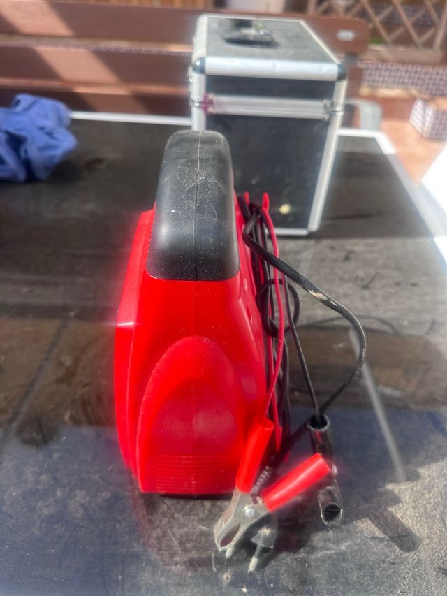 Cargador de batería para coche con pinzas rojas y negras. - Diseño compacto y portátil. - Cables de conexión incluidos.