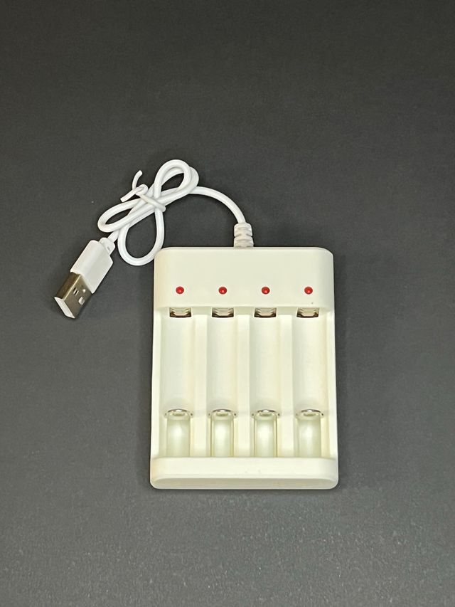 Cargador de pilas blanco con conexión USB. - Capacidad para 4 pilas