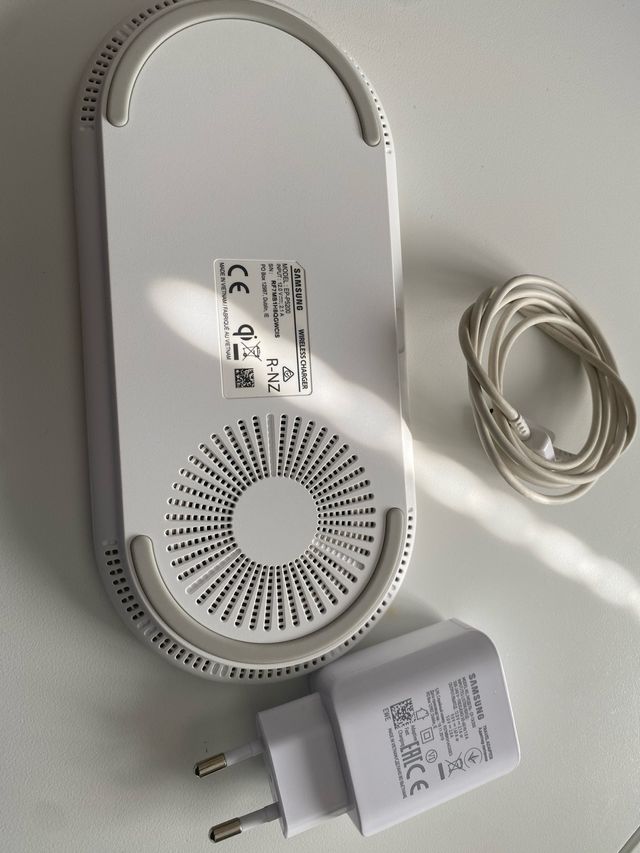 Cargador inalámbrico doble de la marca Samsung, modelo EP-P5200. - Color blanco. - Incluye cargador de pared y cable. - Fabricado en Vietnam.