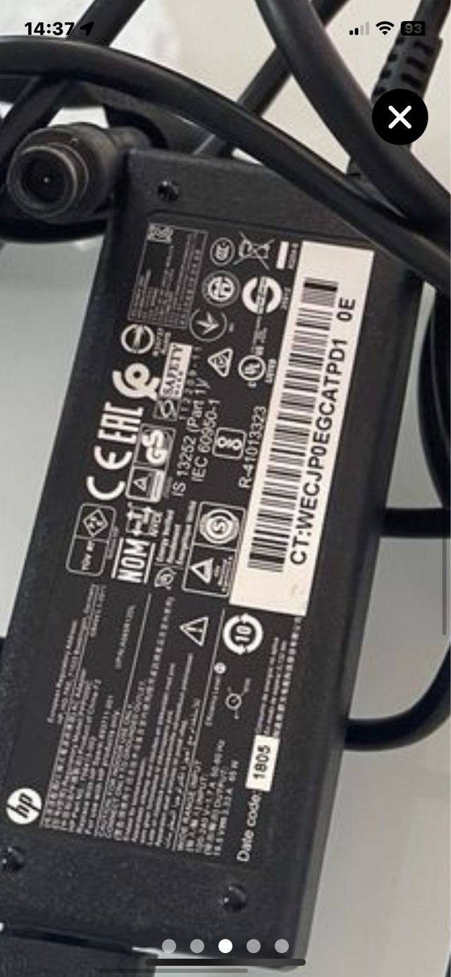 Adaptador de corriente HP. - Modelo: CT:WECJPOEGCATPD1 - Potencia de salida: 65 W - Voltaje de entrada: 100-240 V~ 1.7 A - Voltaje de salida: 18.5 V 3.33 A
