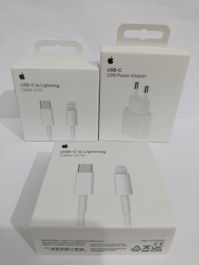 Pack de accesorios de carga para iPhone. - Cargador Apple USB-C de 20W. - Dos cables USB-C a Lightning de 2 metros cada uno.