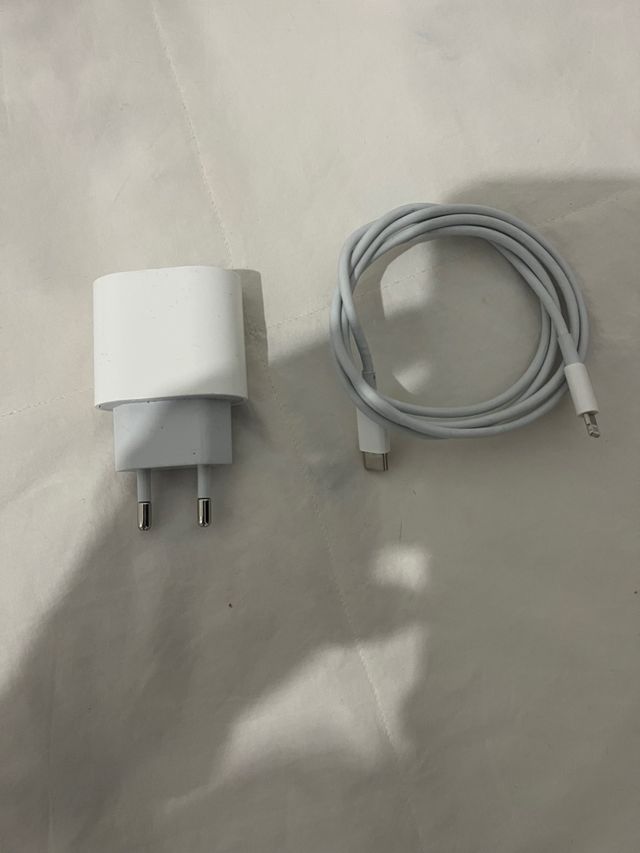 Cargador original de Apple para iPhone, incluye cable. - Adaptador de corriente blanco. - Cable USB-C a Lightning.