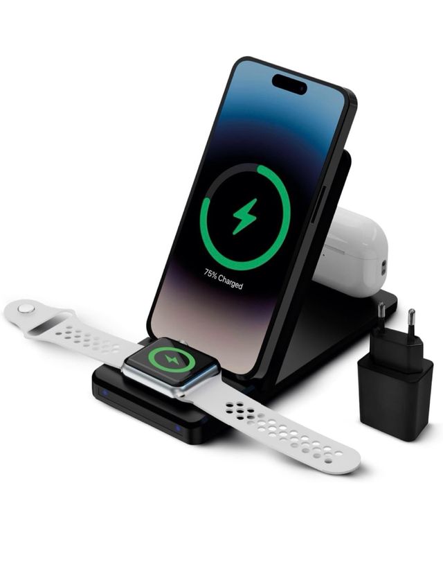 Detalles del productoDescubre la comodidad del **KSIX Base de Carga 3 en 1 Standing Station**. Diseñada para simplificar tu vida, este cargador inalámbrico de 15W es perfecto para mantener siempre listos tus dispositivos: smartphones, auriculares inalámbricos y Apple Watch (Series 1-7). Con su elegante acabado en negro brillo, se integra a la perfección en cualquier espacio.
