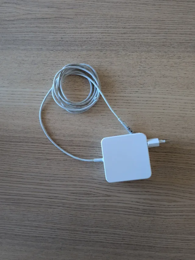 Cargador de Apple para MacBook. Diseño compacto y blanco. - Cable blanco enrollado. - Adaptador de corriente cuadrado.