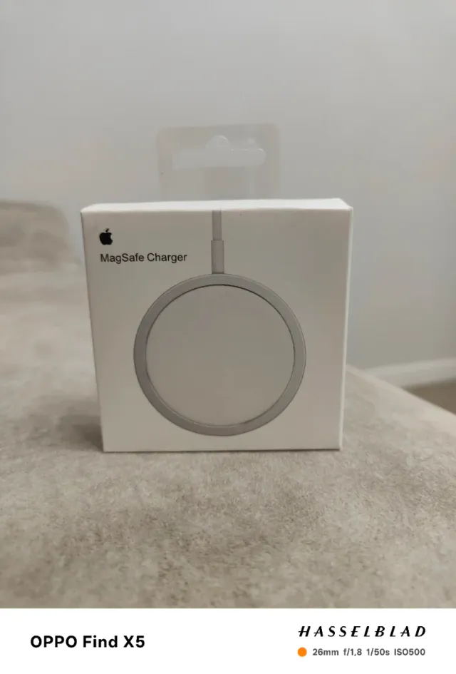 Cargador inalámbrico MagSafe de Apple. - Diseño circular y compacto. - Cable integrado.