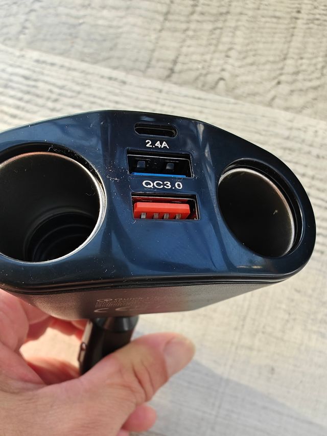 Detalles del productoAdaptador para el mechero del coche con tres tomas para cables USB y tipo c ,y otras dos tomas para conectar aparatos con toma de mechero .