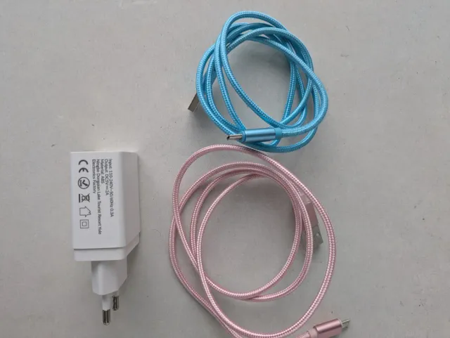 Cargador de pared blanco con dos cables, uno azul y otro rosa. - Entrada: 110-240V-50/60Hz 0.3A - Salida: DC5V=2A - Material: ABS