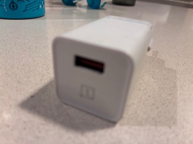 Cargador rápido OnePlus Dash Charge. - Puerto USB-A con interior rojo. - Diseño compacto y blanco.