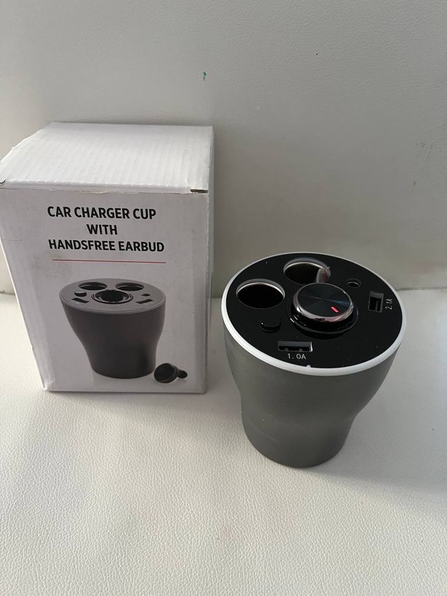 Detalles del productoCargador para coche tipo vaso, perfecto para colocarlo en el portavasos. Incluye 2 tomas de 12V, 2 puertos USB (1.0A y 2.1A) para cargar móviles y dispositivos, y auricular Bluetooth manos libres integrado que se guarda y carga directamente en la base. Funciona por encendedor del coche (12V). Ideal para viajes, mantener cables ordenados y tener carga múltiple sin ocupar espacio. Está nuevo sin usar. Muy práctico y compacto, compatible con cualquier coche con toma de mechero estándar.