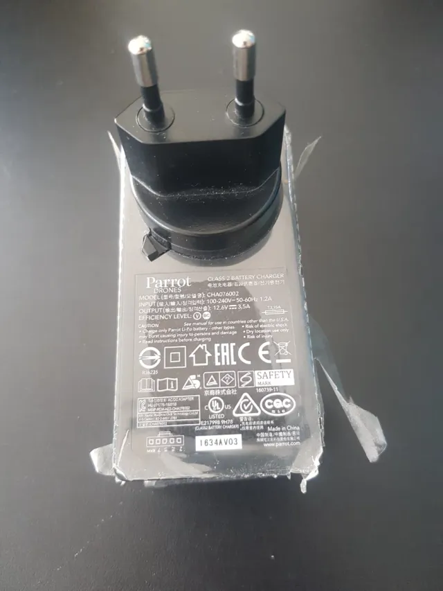 Cargador de batería para Parrot. Número serie 1634Azv03 - Modelo: CHA076002 - Entrada: 100-240V~50-60Hz 1.2A - Salida: 12.6V 3.5A