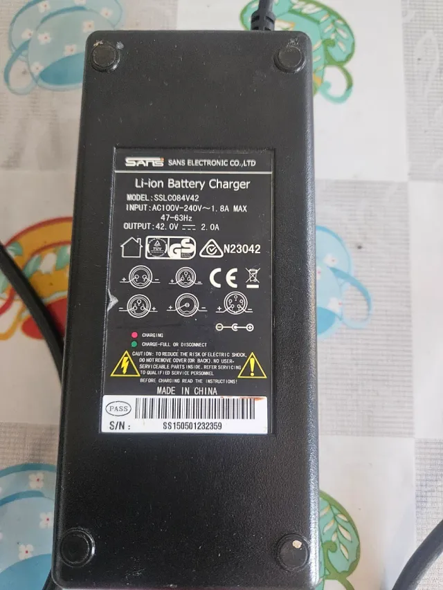 Cargador de patente . - Modelo: SSLC084V42 - Entrada: AC100V-240V~1.8A MAX, 47-63Hz - Salida: 42.0V 2.0A - Fabricado en China