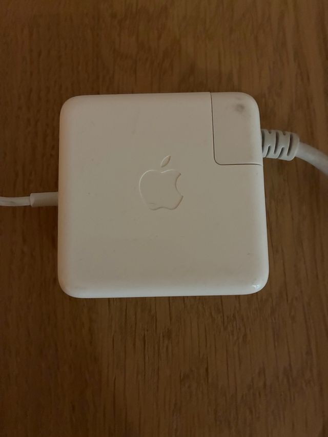 Adaptador de corriente blanco para portátil. - Diseño compacto y portátil. - Logo de Apple grabado en relieve.