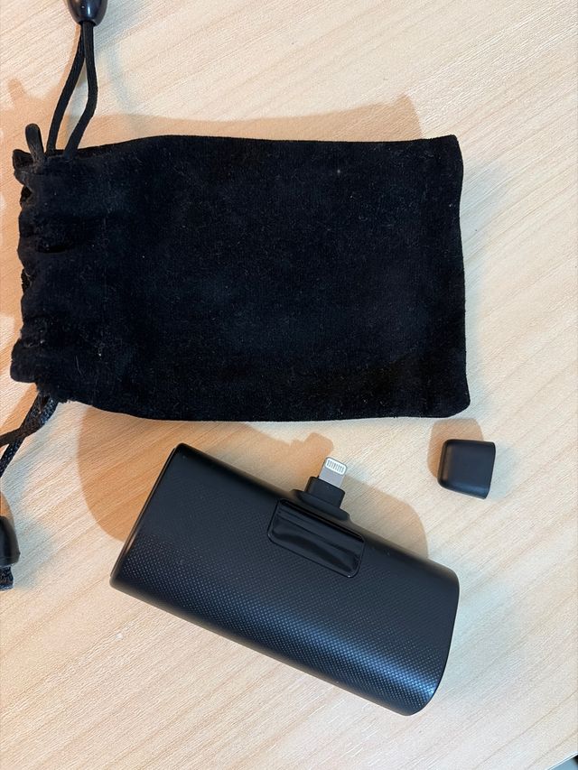 Detalles del productoCargador portátil compacto y elegante, diseñado para dispositivos iPhone. Incluye una funda protectora de terciopelo negro para su transporte y almacenamiento.