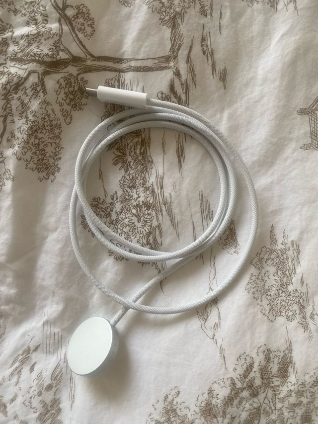 Cargador magnético para Apple Watch. - Diseño circular y compacto. - Cable blanco trenzado.