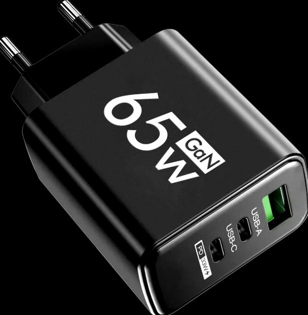 Cargador rápido de alta potencia con tecnología GaN. - Potencia máxima de 65W. - Incluye 2 puertos clase C y un puerto USB.