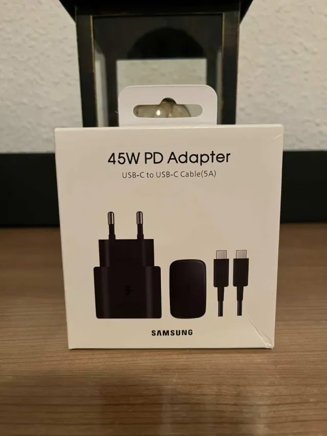 Detalles del productoAdaptador de corriente Samsung de 45W con cable USB-C a USB-C.