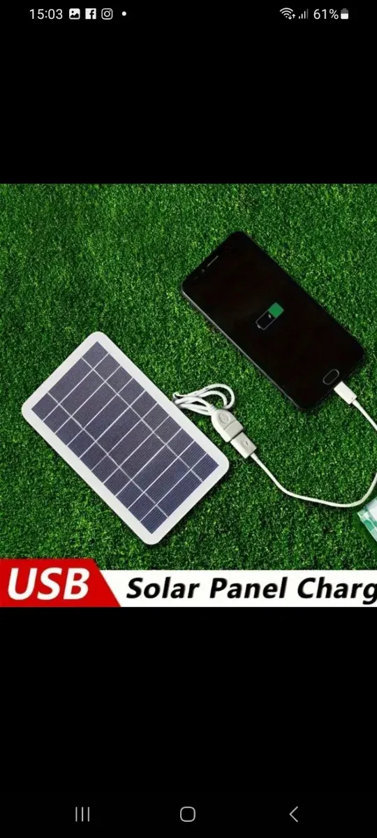 Detalles del productoPanel solar portátil para cargar dispositivos electrónicos mediante USB. Ideal para llevar de viaje o usar en exteriores.