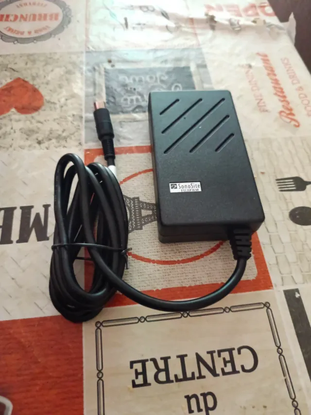 Cargador de la marca SonoSite. Es un accesorio de alimentación eléctrica. - Color negro. - Diseño con líneas diagonales en la parte superior. - Incluye cable de conexión.