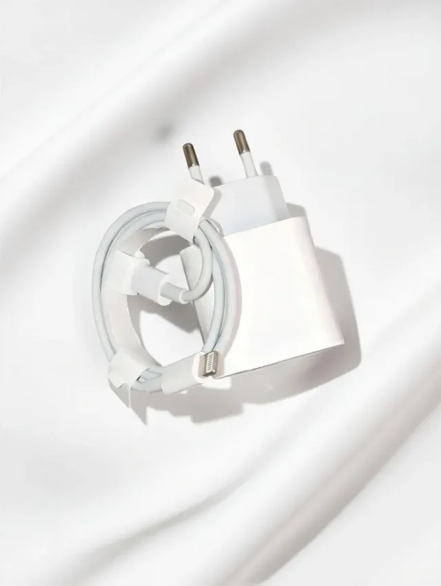 Cargador de pared blanco con cable Lightning para dispositivos. - Enchufe europeo. - Cable blanco.