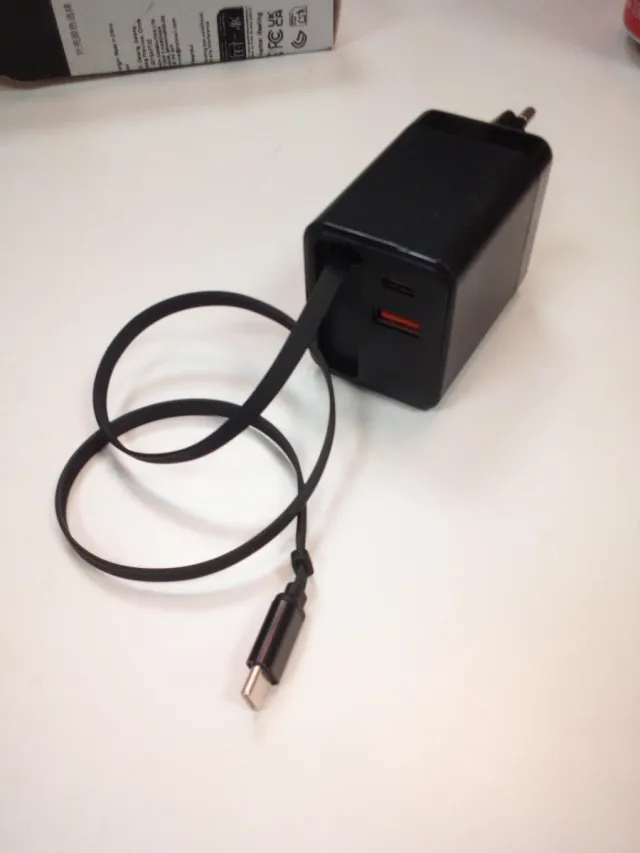 Cargador de pared con dos puertos USB-C en color negro. - Diseño compacto. - Dos puertos de carga rápida.