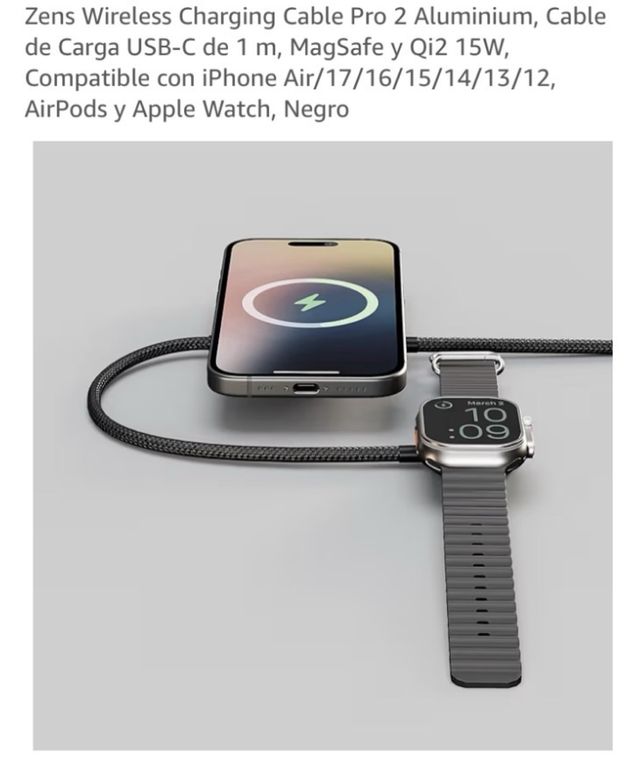 Cable de carga Zens de aluminio para iPhone, AirPods y Apple Watch. - Longitud de 1 metro. - Compatible con MagSafe y Qi2 15W. - Color negro.