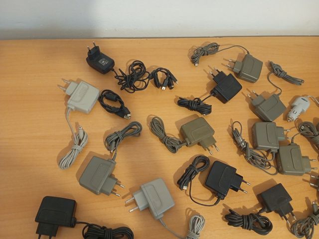 Lote de cargadores para dispositivos Nintendo. Cuestan 10 € cada uno. - Incluye varios modelos de cargadores. - Diseños variados en color gris y negro.