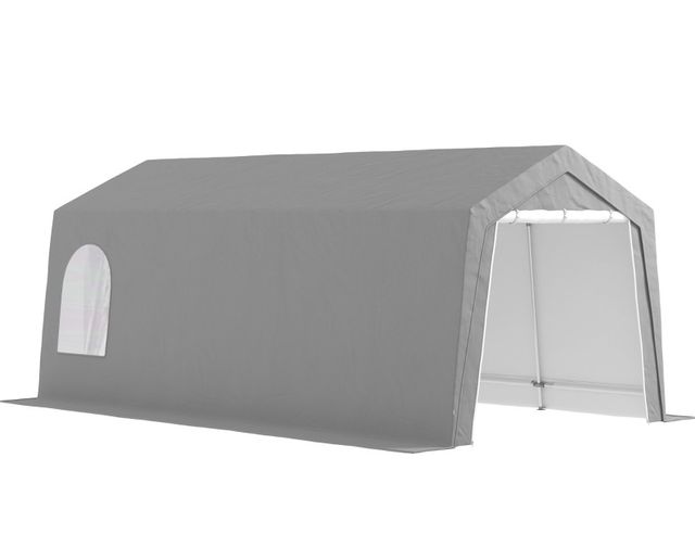 Detalles del productoCarpa de Almacenamiento Exterior 3x6 m con Tela PE Resistente al Agua y Rayos UV Puerta Enrollable y Ventanas Gris.