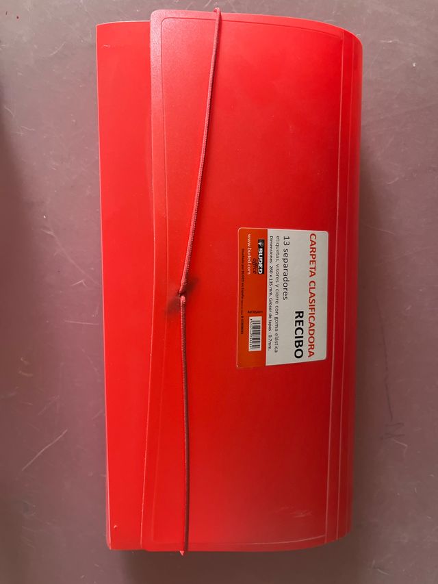 Detalles del productoCarpeta clasificadora de color rojo, ideal para organizar recibos.