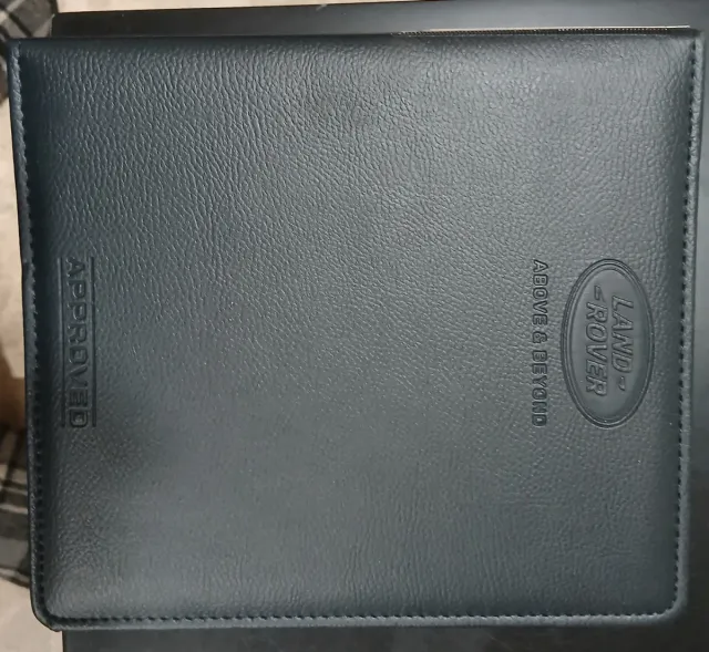 Carpeta de piel negra para documentación de Land Rover. - Logo de Land Rover Above & Beyond grabado. - Sello APPROVED en relieve.