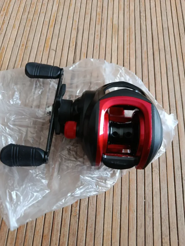 Carrete de pesca tipo baitcasting en llamativos colores negro y rojo. Diseñado para lanzar señuelos con precisión.