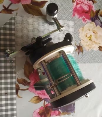 Carrete de pesca para curricán, con hilo de color verde. - Mango giratorio. - Cuerpo principal blanco y negro.
