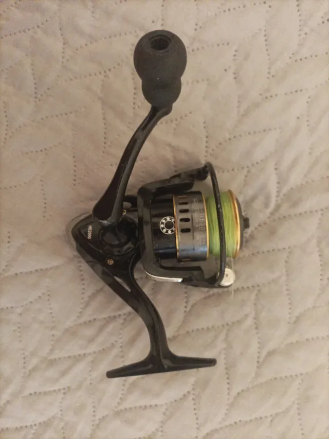 Carrete de pesca en color negro con detalles plateados y bobina con hilo verde. - Mango giratorio. - Cuerpo principal de metal y plástico.