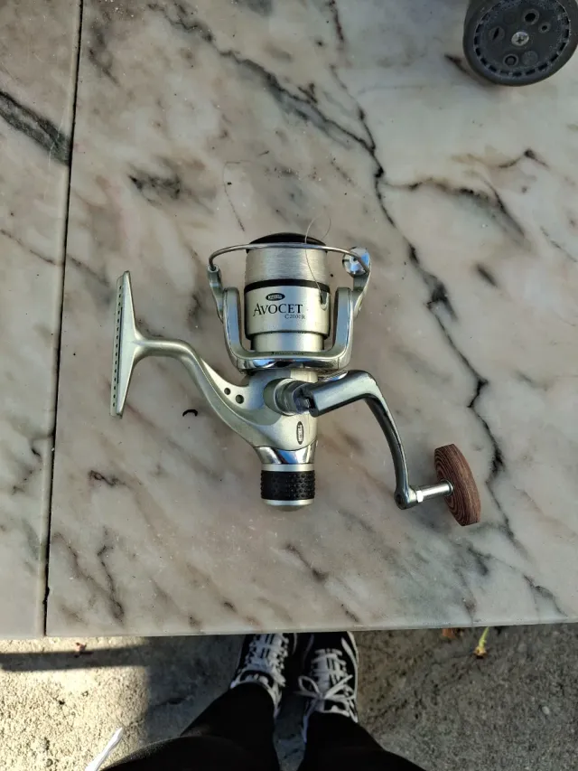Carrete de pesca plateado con detalles en negro y mango de madera. - Modelo: AVOCET C2000R - Marca: Abu Garcia