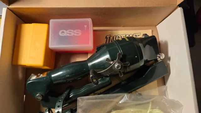 Carrete de pesca Instant en color verde oscuro. Incluye caja de accesorios QSS y un bloque amarillo. - Carrete de pesca. - Caja de accesorios QSS. - Bloque amarillo.