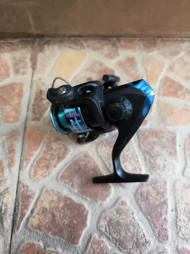 Detalles del productoCarrete de pesca con un diseño moderno en negro y detalles azules.