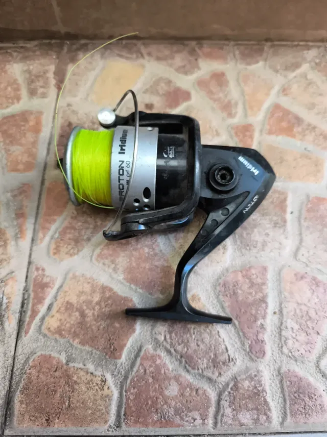 Carrete de pesca marca PROTON, modelo Iridium. - Color: Negro y plateado. - Hilo de color verde lima. - Modelo: pf 60.