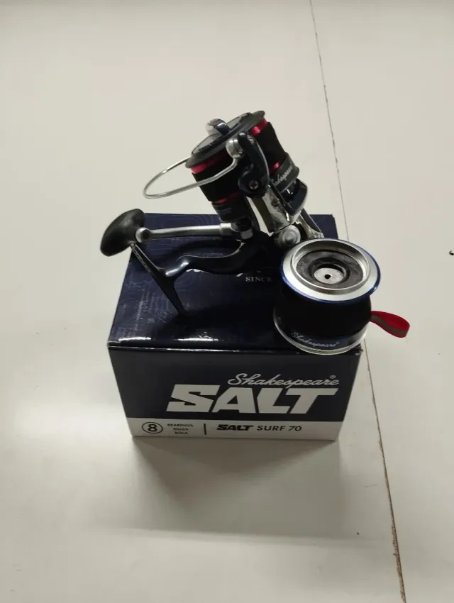 Carrete de pesca Shakespeare SALT SURF 70. - Diseño en color negro y rojo. - Incluye bobina adicional.
