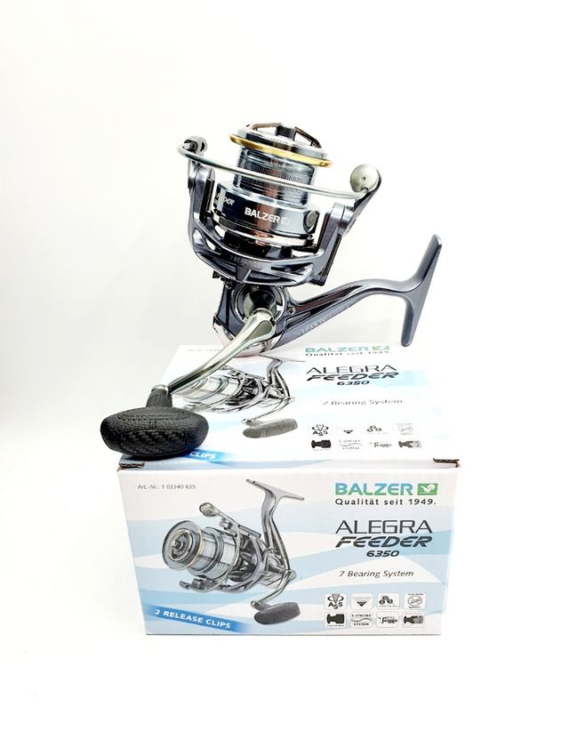 Detalles del productoCarrete Balzer Alegra Feeder 6350 (Made in Germany), con 7 Rodamientos, Quick stop system, Sistema S Stroke para el enrollamiento perfecto del hilo, Sistema de equilibrado del Rotor ASS, Freno delantero micrómetrico, Bobina de Aluminio
