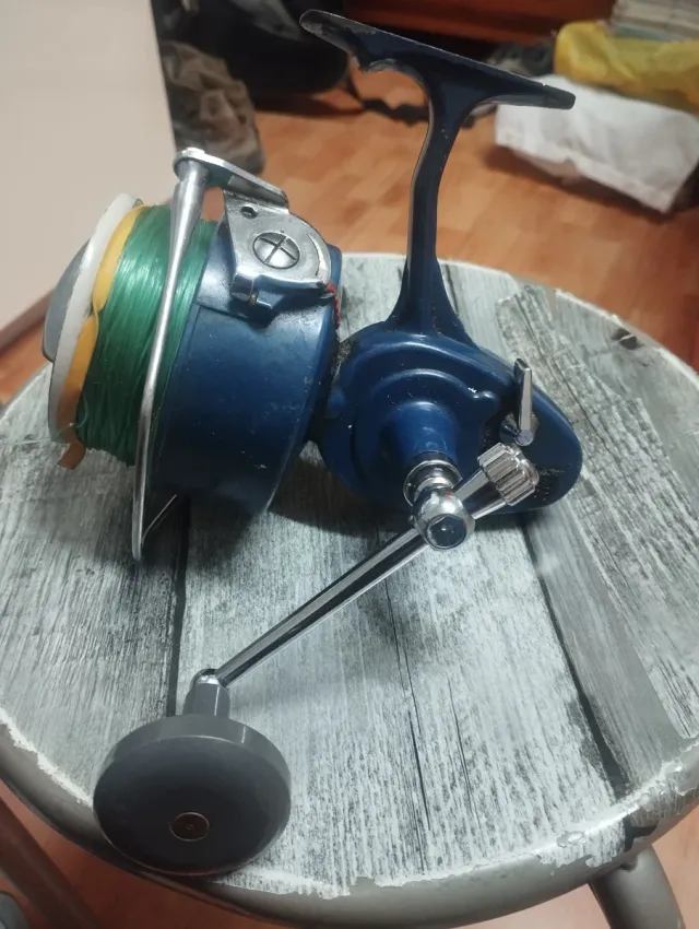 Carrete de pesca Mitchell 488. - Cuerpo azul. - Bobina con hilo verde y amarillo. - Manivela plateada con empuñadura gris.